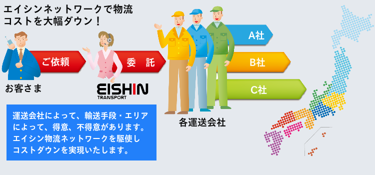 保管から輸送まで、最適な物流コーディネートを行います。 運輸サポートシステム お客様の大切な荷物をいつも同じ配送会社にまかせてはいませんか?配送会社によっては、あまり得意でないエリアや、最適でない輸送手段もございます。 エイシンでは、お客様のニーズに合わせて配送手段をコーディネート。 最適な運輸会社にそれぞれ委託することで、物流のムダを省き、物流コストを削減いたします。 運送会社では不可能な、保管サービスやピッキング、加工作業など。英真では低コストで業務を請け負います。倉庫内作業での様々なノウハウを持つ英真が、お客さまに代わって、正確に代行いたします。 運輸サポートシステム 物流プラットホーム 輸配送管理TMS 品質改善への取り組み