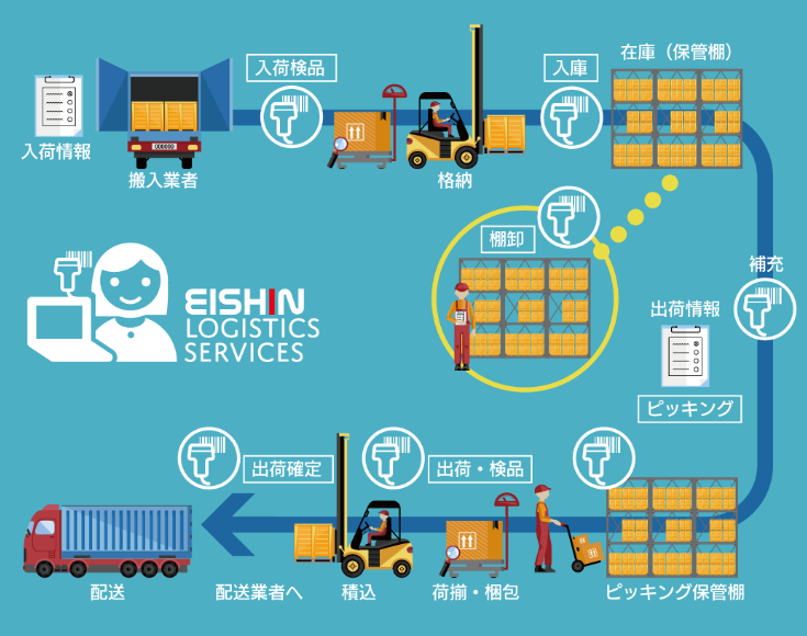 英真では、ロジスティック部門の受託はもちろんお客さま社内での物流システム構築のプランニングからスムーズな運営までお手伝いいたします。