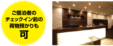 スタンダードキャビンをご利用のお客様は、まずロッカールームヘ。お客様にお渡ししたロッカーキーと同じ番号のロッカーをご利用下さい。ロッカー内には館内着とタオルが入っております。こちらで館内着にお着替えいただきます。もちろん私服のままでも結構です。また、ロッカーに入らないお手荷物はフロントでお預かりもしております。