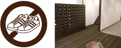 館内は土足厳禁となりますのでご来館後にお履物を下足ロッカーへお入れ下さい。下足ロッカーキーはお客様で管理をお願い致します。また、番号の指定はございませんのでお好きな場所(番号)をご利用下さい。