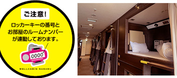 ロッカーキーと同じ番号の客室をご利用下さいませ。ふかふか羽毛布団にTV・アラーム時計など設備充実。